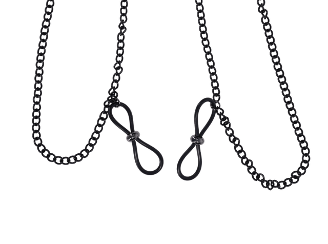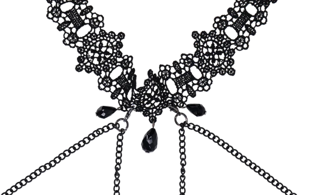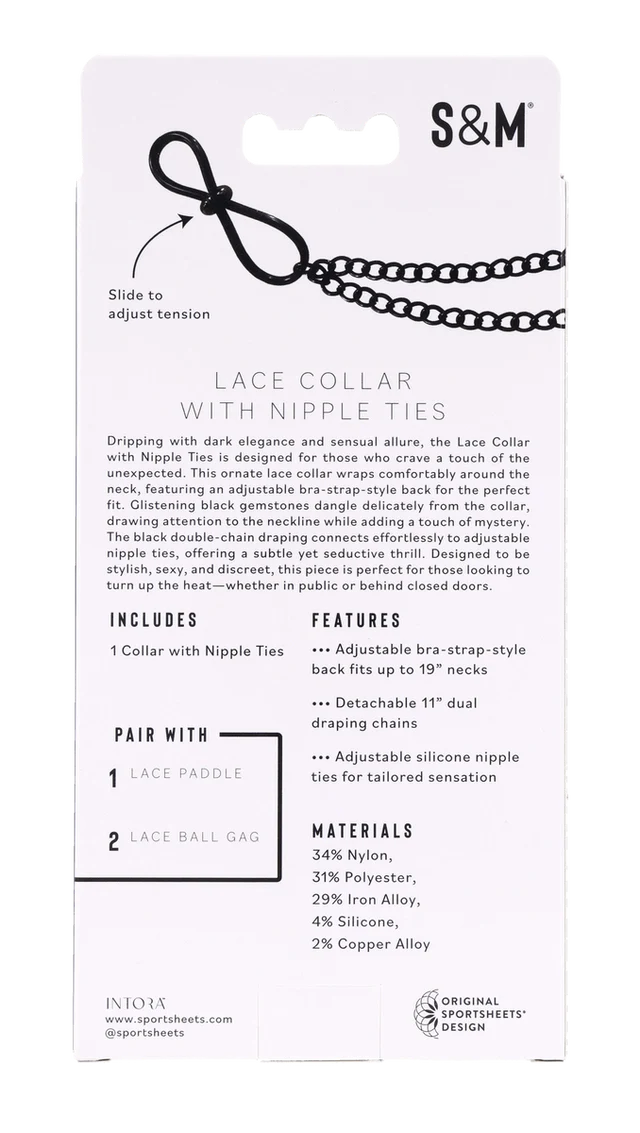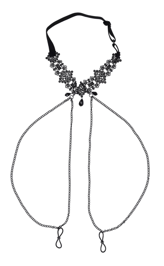 Crafted from ornate lace, the collar wraps comfortably around the neck and features an adjustable bra-strap-style back, ensuring a perfect fit for necks up to 19” (48.3 cm). Glistening black gemstones dangle delicately from the collar, drawing attention to the neckline while adding an air of mystery and sophistication. Two detachable black draping chains extend from the collar to adjustable silicone nipple ties, offering a subtle yet thrilling connection that heightens sensation and play.