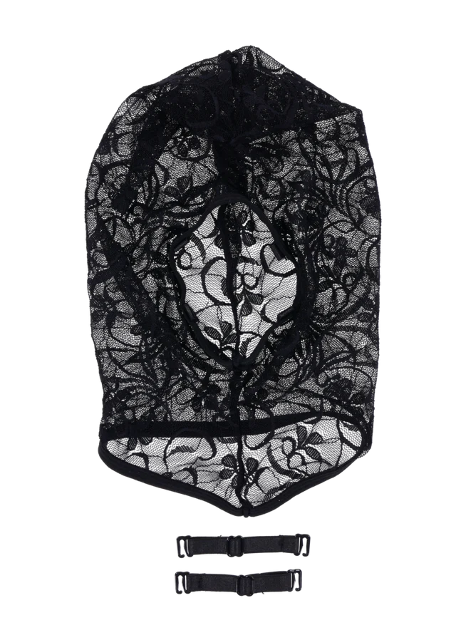Crafted from sheer floral lace, this full-coverage hood allows partial visibility, leaving just enough to the imagination and heightening anticipation with every glance. Its defining feature—two removable mouth straps—offers customizable control, letting you choose between gentle restraint or more intimate access, creating a dynamic play of power and desire.