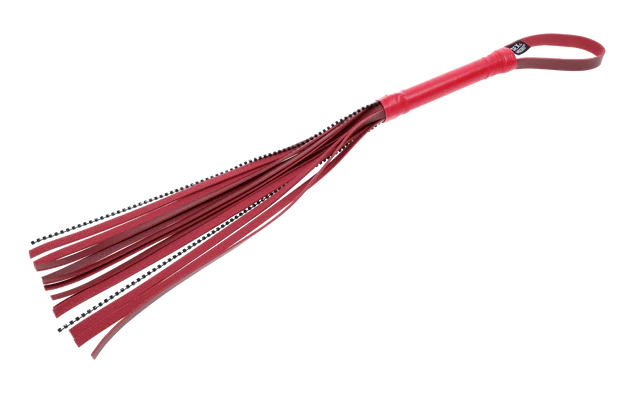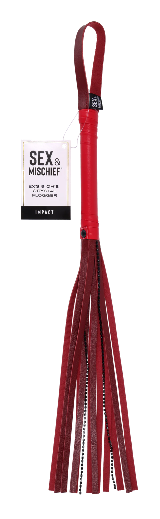 Add a touch of sparkle to your play with the Ex's & Oh's Crystal Flogger. This stunning flogger combines style and sensation with a light red faux leather handle and dark red falls that are perfect for delivering a range of sensations. Mixed among the falls are strands of black crystals that not only add a captivating shine but also bring a unique intensity to every swing. Whether you're exploring soft caresses or sharper strokes, this flogger promises to dazzle and delight, making every moment both beautiful and thrilling.