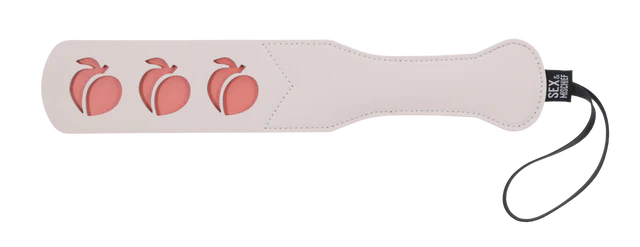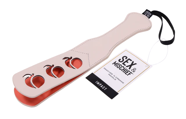 Add a sweet twist to your playful spanks with the Peaches ‘N CreaMe Peach Paddle! Petite yet powerful, this paddle is perfect for blending playful teasing with saucy sensations. Crafted from soft faux leather and adorned with charming peach-shaped cutouts, it delivers a satisfying smack while adding a flirty, whimsical touch. The split tip design ensures each swat lands with maximum impact, making it perfect for both gentle taps and firmer, more mischievous spanks.