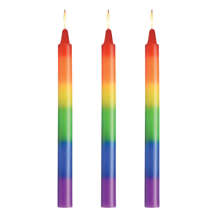 Transform your steamy scenes together and queer them up with our Pride Rainbow Drip Candles! Each of the three candles are layered with vibrant colors that display the full spectrum of the rainbow. These unscented wax play candles are perfect for adding a touch of visual excitement and temperature play to your intimate scene. As you drip the smooth, hot wax on your skin or your partner's, you'll experience the stunning transition of colors along with the pleasing sensation of hot wax! Perfect for parties or photoshoots, these candles not only provide a kinky sensation but also create stunning body-art to share and admire. Ideal for those sensitive to perfumes, our unscented candles offer an exquisite experience without overwhelming your senses.